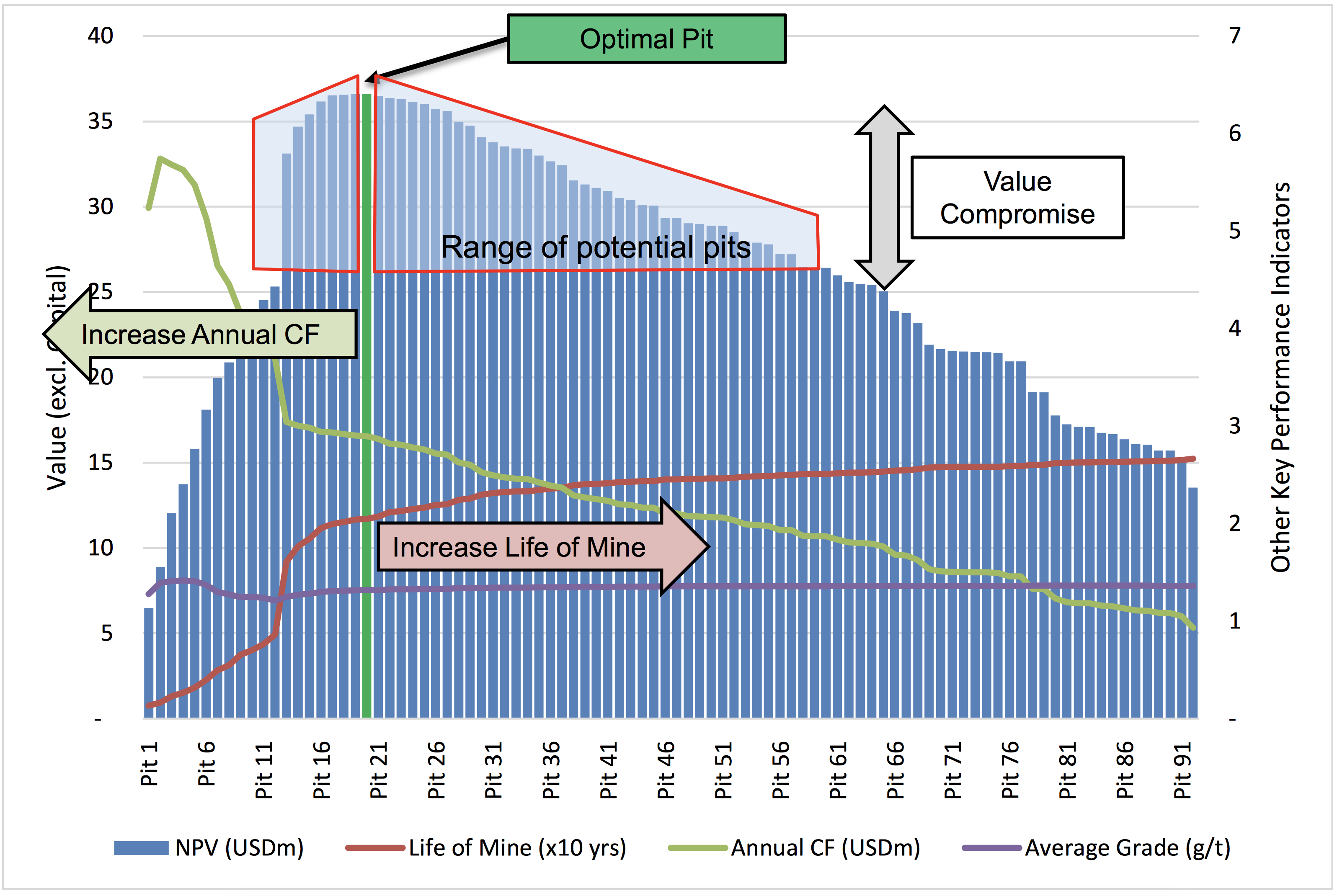 - Pit optimisation is a iterative process further future analysis after the initial pit optimisations can add strategic gain